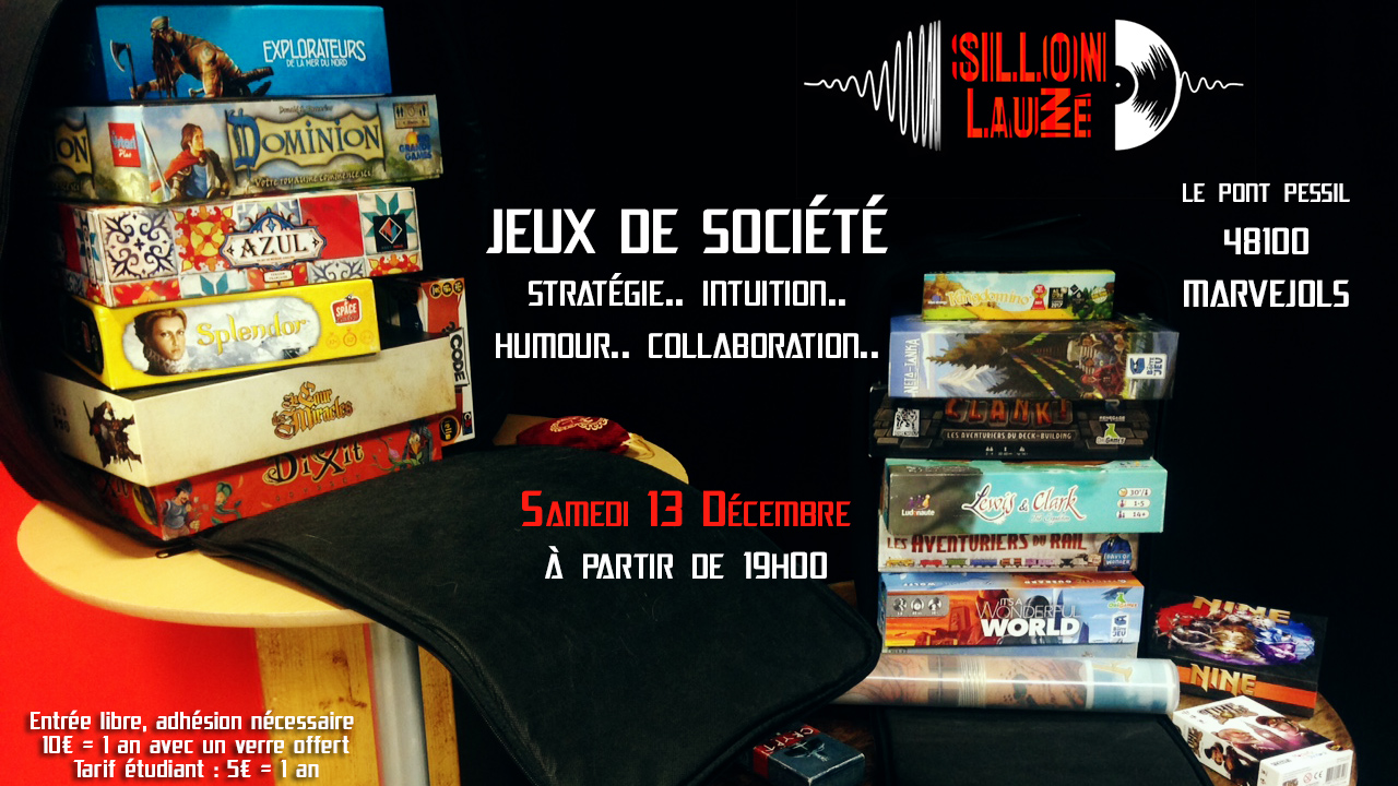 Samedi 13 Décembre, les bénévoles du Sillon Lauzé vous proposent une nouvelle occasion de venir profiter – comme toujours, en toute convivialité – d’une soirée jeux de société, dans l’atmosphère chaleureuse et confortable de notre local du Pont Pessil, avec plein de jeux de société à essayer ! Vous pourrez bien sûr également apporter vos propres jeux pour les faire découvrir : jeux de cartes, de dés, de plateau, escape games… Qui demandent stratégie, réflexion, collaboration, humour, habileté, rapidité… Tous les coups seront permis… dans le respect des autres, la joie et la bonne humeur, bien sûr !!