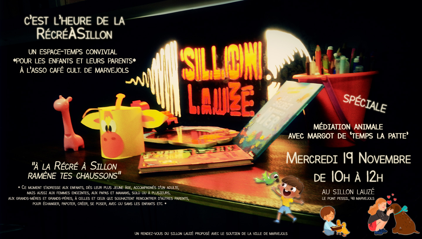 Mercredi 19 Novembre, les bénévoles de la récré du Sillon Lauzé vous proposent un rendez-vous inédit et tout particulier ! De 10h00 à 12h00, venez profiter d'un agréable moment partagé parents/enfants, autour des rencontres et du bien-être avec l'association 'Temps la Patte'.. Nous vous invitons à venir retrouver les bénévoles du Sillon Lauzé autour d'un petit […]